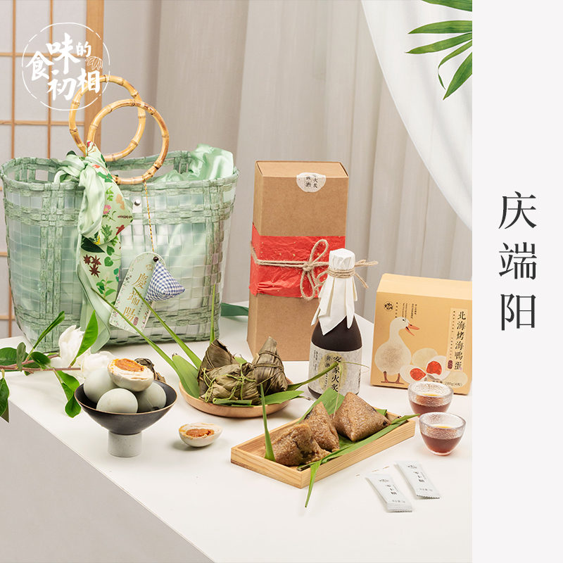 “轻汗微微透碧纨,明朝端午浴芳兰。”东坡先生轻盈的诗意,极是搭配这份较之“庆端阳”更轻简些的礼盒搭配。外包装是双层加高的定制竹编蒸笼,提在手里很有拙趣,也寓意着“蒸蒸日上”。