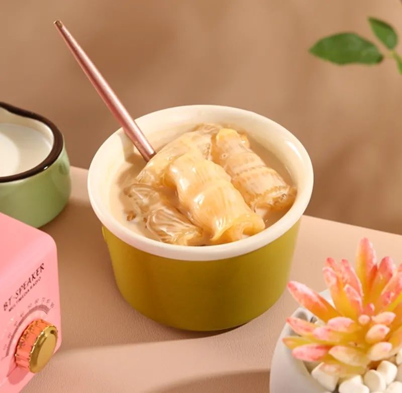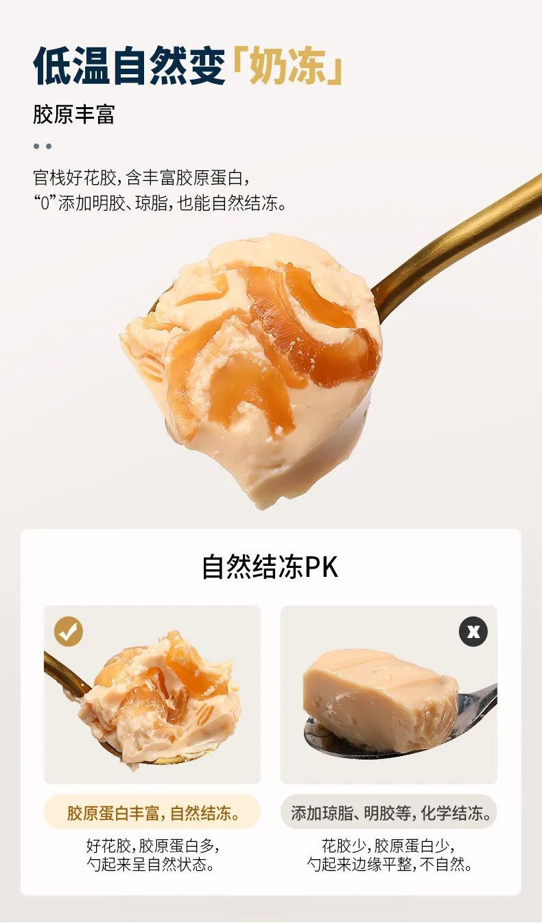 官栈花胶吃起来胶多粘嘴,胶质丰富,这是因为采用分级纯奶鲜炖,不加1滴水,胶原蛋白一部分以胶原蛋白小分子肽的形式融入纯奶中,一部分保留在花胶中,让胶原蛋白更好地被吸收。