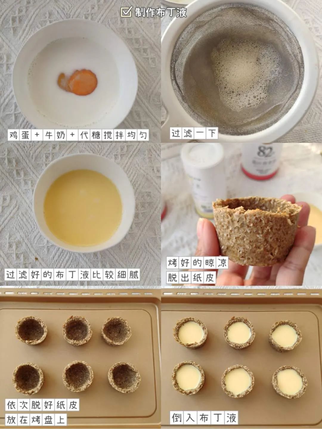 ④ 制作布丁液:100ml牛奶+1个鸡蛋+10g代糖,搅拌均匀后过筛;