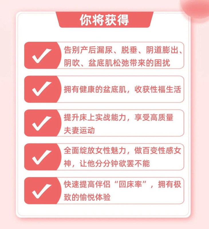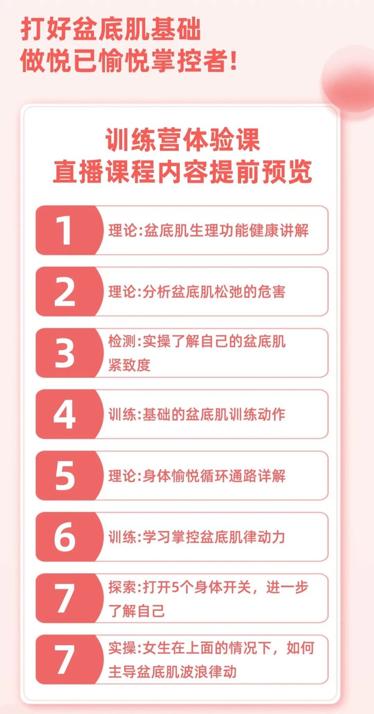 大型连锁妇产医院安琪儿直接邀请她加盟,成为两性健康教育讲师。她深知光靠线下能帮到的人有限,她想把这套训练方法分享给更多人。为此,她和她的团队不断地总结和提炼,从训练方法中提取核心部分,进行线上分享。组成5天的科学锻炼盆底肌体验课,手把手教女性,了解和改善盆底肌问题,开启全新“性”体验。不少女读者,也是在学了这门课程之后,开启了情趣生活的大门。说真的,我也上过很多网课,可艺嘉的课,可以说是我非常愿意推荐给大家的课程了。这是一套立足于基础盆底肌功能康复强化之上,帮女性学会自主收获两性欢愉的入门训练法。这套课程在线下私教需要39800元/次,还很难约,现线上课程原价99元,前100名仅需9.9元,即可获得!!如果你迫不及待想要改善你的盆底肌,提升你的性品质、性自信和性魅力,那就直接扫下图海报,报名听课吧!为期5天的科学锻炼盆底肌体验课包括:3天社群课+2天艺嘉老师真人出镜直播指导课,为确保更好的课程效果,仅限女生报名。课程内容涉及:两性愉悦背后的原因、如何达到愉悦、如何自测盆底肌紧实度、进行盆底肌基础训练,带你找准5个敏感点等···C点:可以产生瞬间愉悦,电击般来去匆匆,却意犹未尽...相信在艺嘉老师指导下,找对这5点,再通过强化盆底肌,控制律动,伴侣和你都将得到“想要的欢愉体验”。在艺嘉的指导下,一段时间后,漏尿的问题有了好的变化。通过课程训练,恢复到跟以前的紧致,和老公都重新和谐了~艺嘉的学员涵盖各个年龄段,大家有一个共性:像艺嘉一样,收获健康和愉悦,有幸福的能力。你,难道不想拥有吗?如果你想改善盆底肌问题、过上和谐的幸福生活、获得亲密的两性关系,却不知从何处下手?