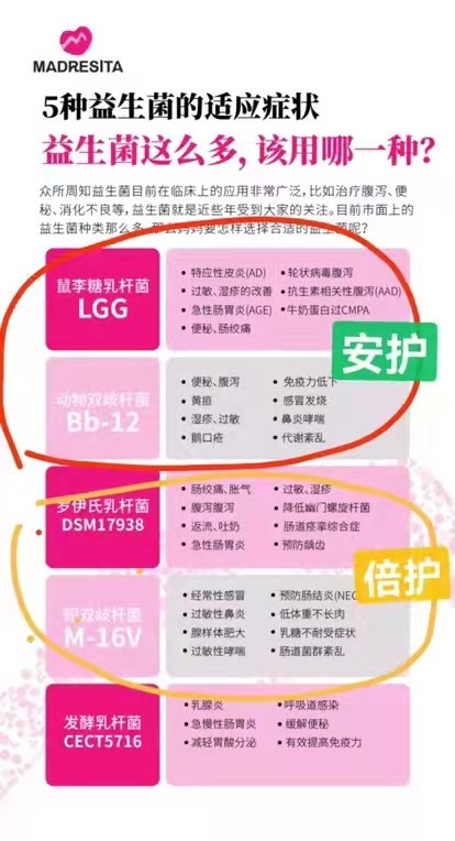 不同的病症一定要选用对应的菌株,在此其实我很想给大家推荐玛西塔益生菌,非常值得赞赏的产品,前段时间有个群里宝宝有肠绞痛、腹泻、蛋白过敏等等问题,如果选择益生菌的话最少也要选择两种,不过当最后找到玛西塔益生菌的时候,让我感觉玛西塔里面菌株的适用范围真的很广,性价比对比起来比较高 ,一瓶就搞定。