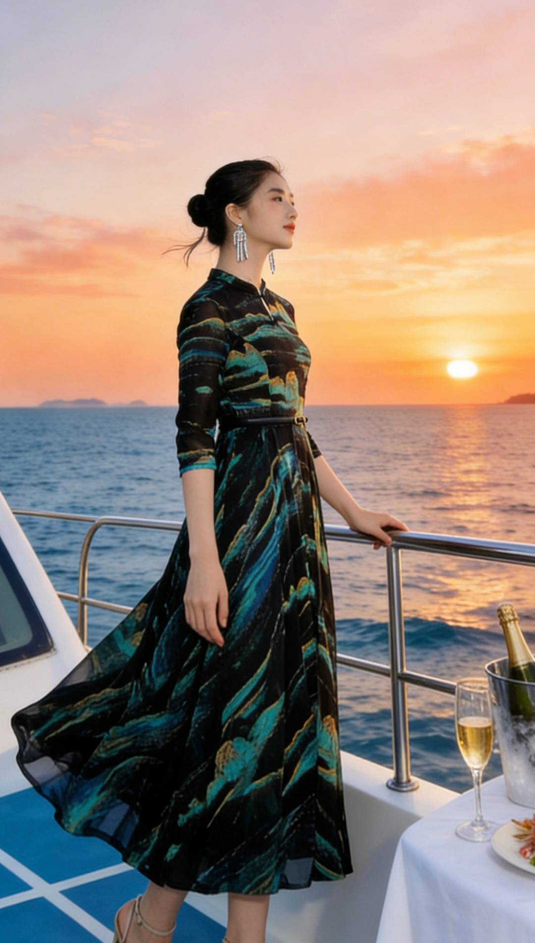 HJ1S48 石绿色高弹网纱连衣裙,面料舒适透气,印花图案采用了千里江山图,充满中国传统韵味的设计元素,将你的气质与国风完美融合。穿上它,就像是走在千里江山图中,感受那份浓厚的中国风。定制了一条精致的皮带,不仅增加了裙子的时尚感,还能让你更好地调整裙子的宽松度,让你的穿着更加舒适。立领加上盘扣点缀,凸显优雅,修身剪裁和超大裙摆设计,既显瘦又显高,走路摇曳生姿,兼具时尚、舒适和优雅。