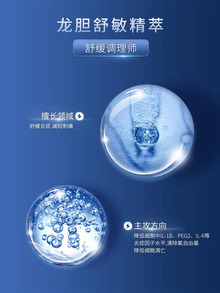 加入龙胆舒缓精粹不仅降低肌肤炎症因子水平,精准扑灭肌肤情绪小火苗,还能有效清除氧自由基,像春雨般润物细无声,给脾气古怪的躁动肌注入生命力,降低细胞凋亡。