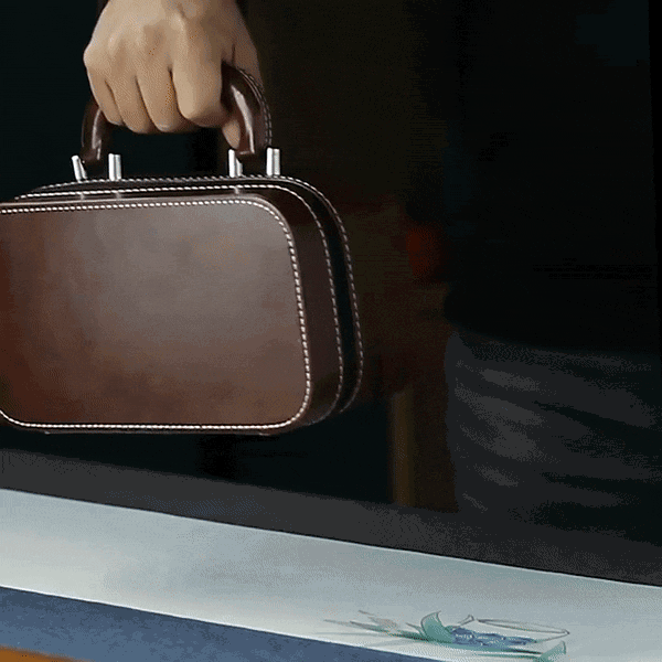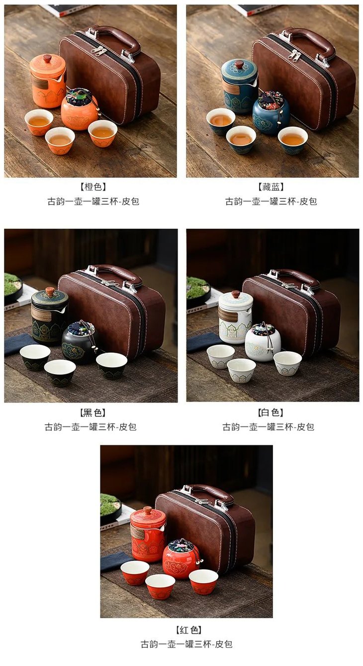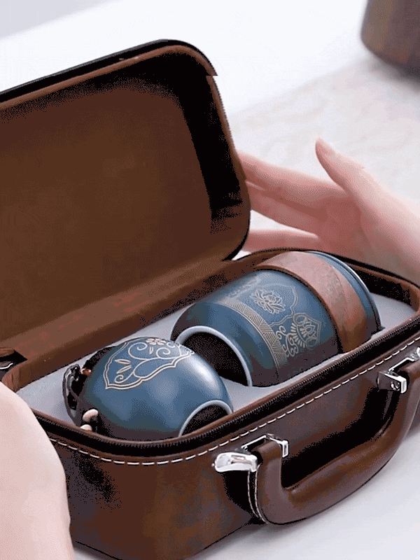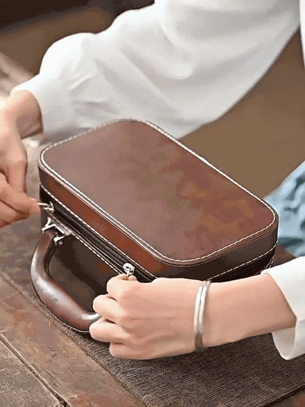这套古韵旅行茶具采用皮质小包进行收纳,整体小巧精致,手提方便。