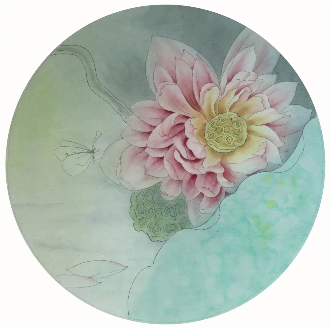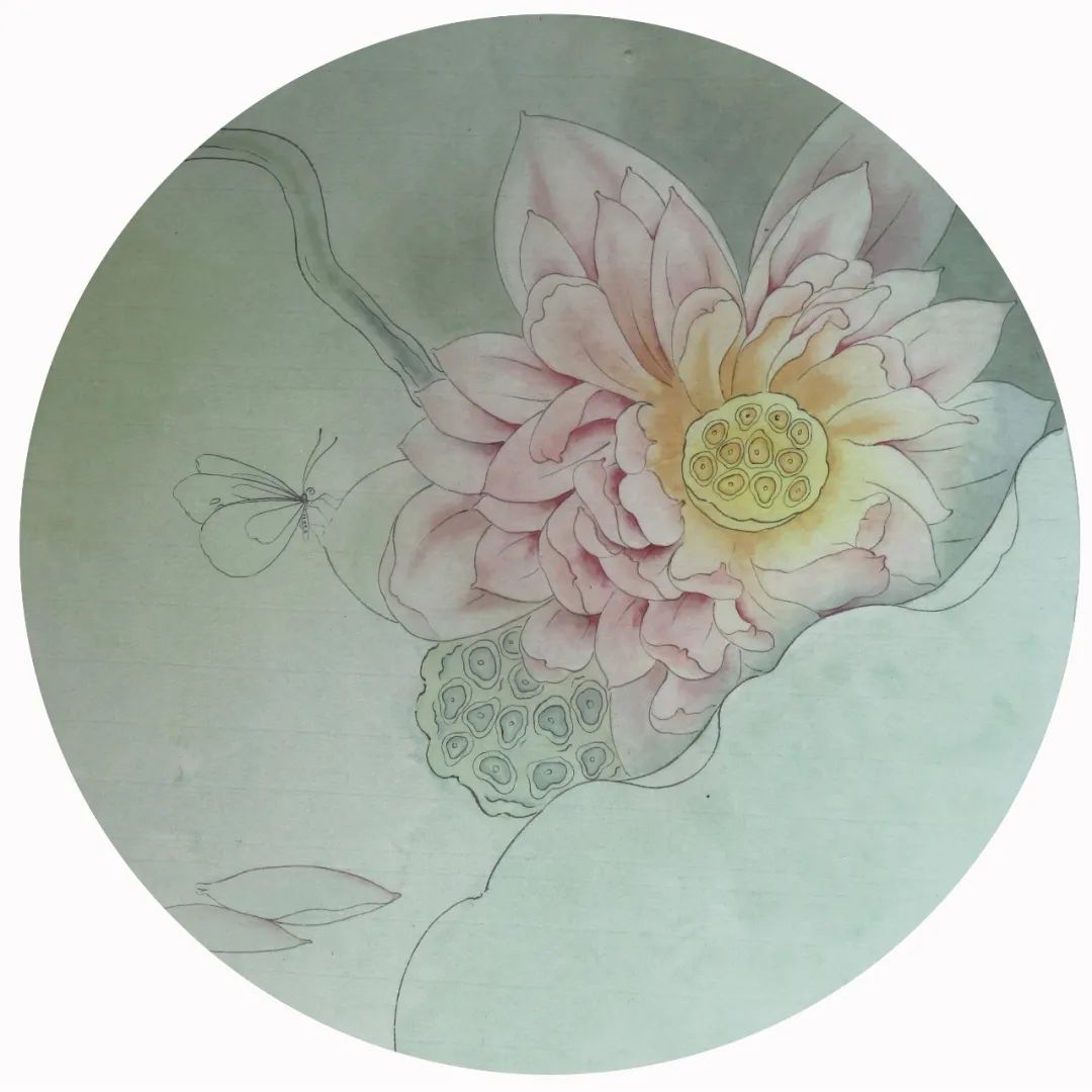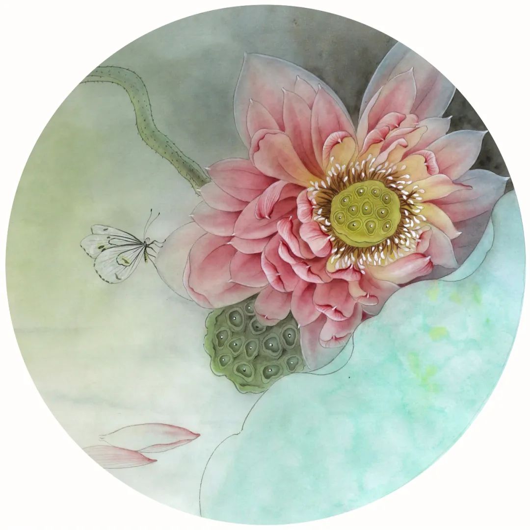 立粉点花蕊,所有反瓣根部提染白粉。大莲蓬莲子深草绿掏染后尖部立粉。细画蝴蝶。荷梗用藤黄提出高光后点是梗刺。落款