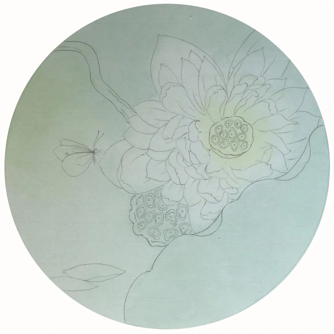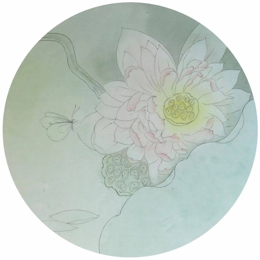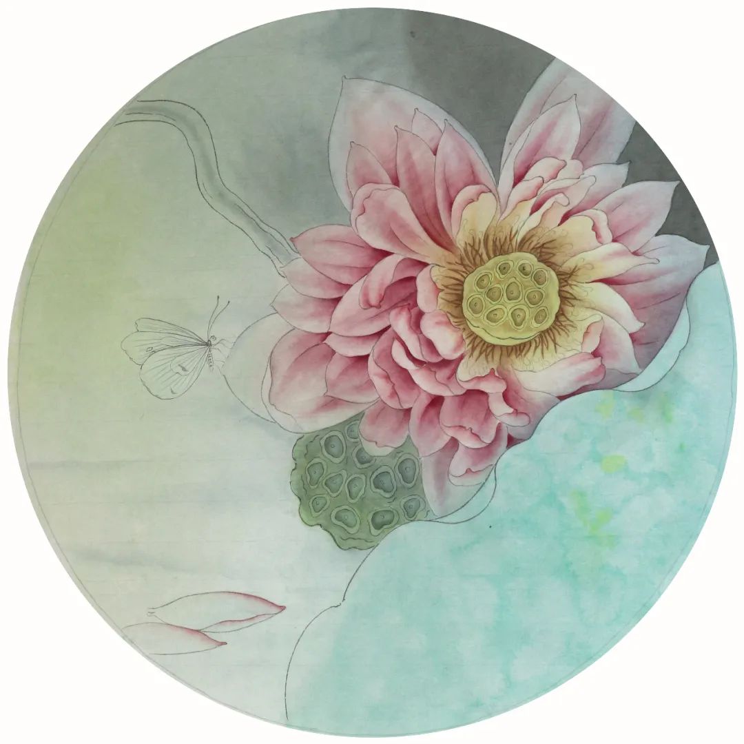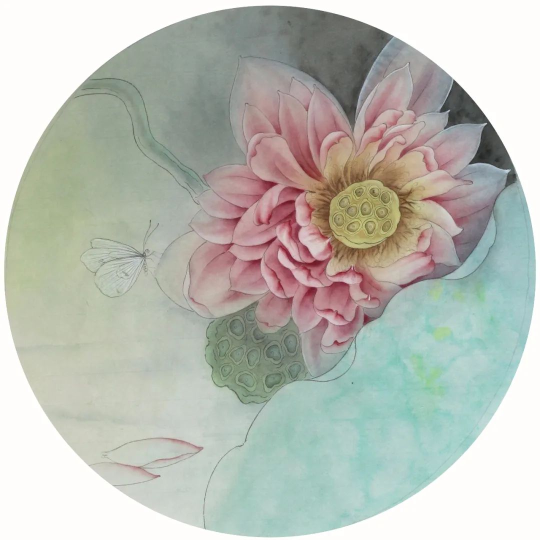 立粉点花蕊,所有反瓣根部提染白粉。大莲蓬莲子深草绿掏染后尖部立粉。细画蝴蝶。荷梗用藤黄提出高光后点是梗刺。落款