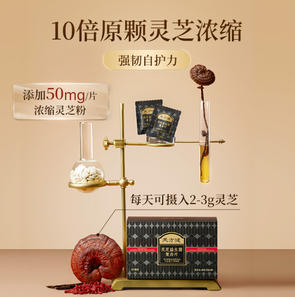天方健灵芝益生菌复合片,每片添加50mg浓缩灵芝粉,蕴含10倍灵芝精粹,39%灵芝粗多糖,40%+菌菇多糖,12亿专利益生菌。