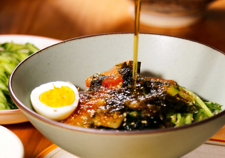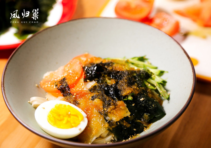 第三步,开水煮面,煮至断生后捞出过常温水,放入海带芽、山药片、黄瓜丝、西红柿片,半个鸡蛋,海苔丝、熟芝麻,倒入调好的料汁,最后淋上香油或橄榄油,搅拌均匀即可