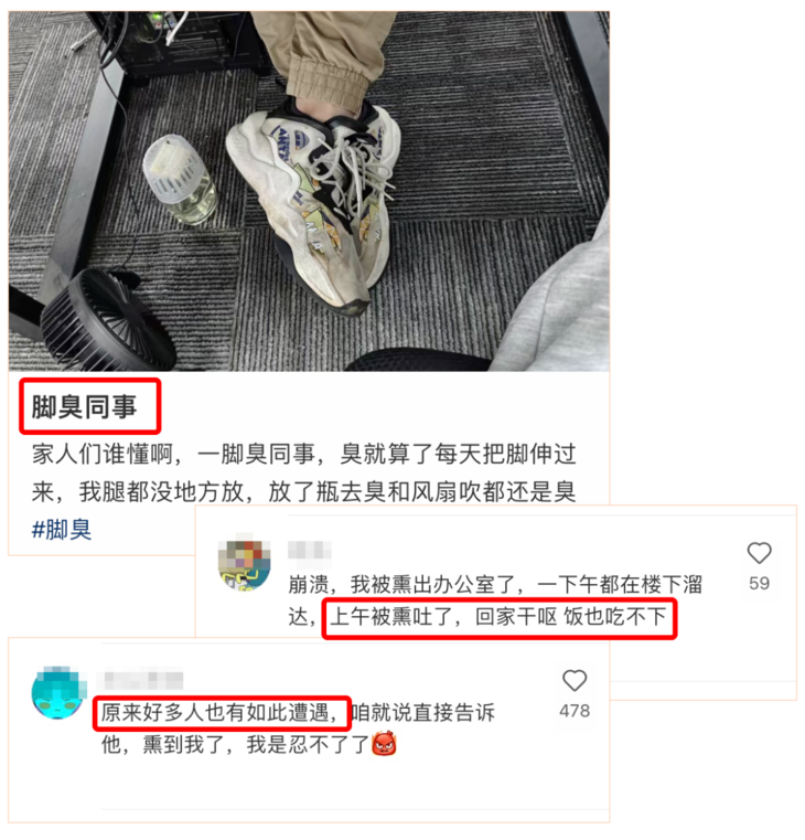 甚至还会因为闷得脚臭,被同事悄悄挂在网上吐槽: