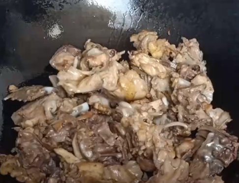 1、热锅凉油,放入多半勺油(炒菜勺),放入掰好的鸡架翻炒,炒到鸡架有些干时把鸡架捞出,把多余的油倒出来;