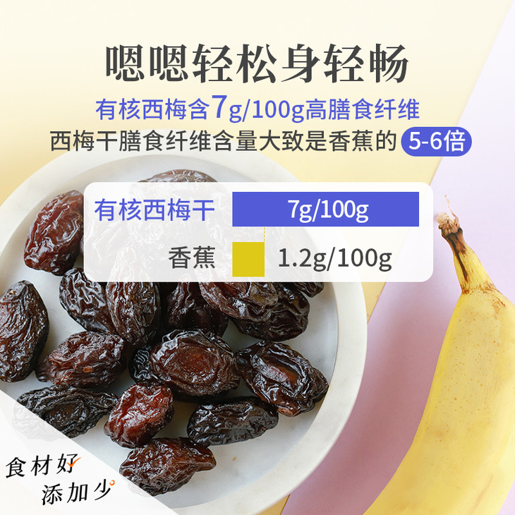 1、洁净配料:配料表只有西梅,机器去核,0添加,0蔗糖。(市面上大部分都会有添加剂和白砂糖)