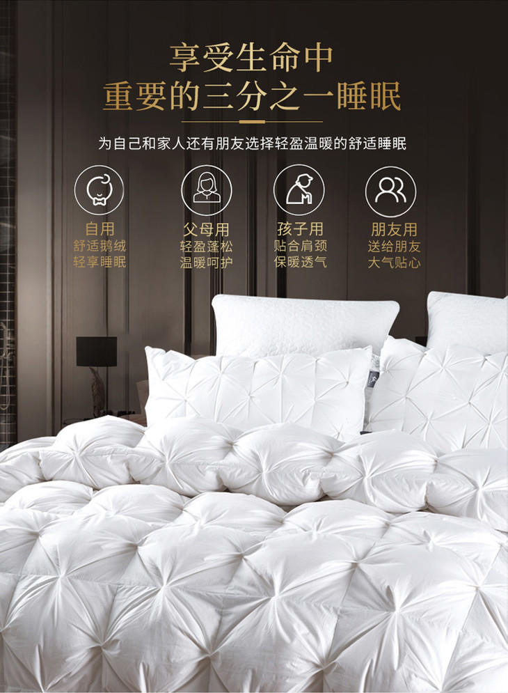 相比于鸭绒、羊毛、蚕丝,鹅绒被不仅更保暖,还防潮排汗、蓬松柔软、抗螨、更持久耐用,这也是为何能带来“五星睡感”的原因、更奢华的原因。