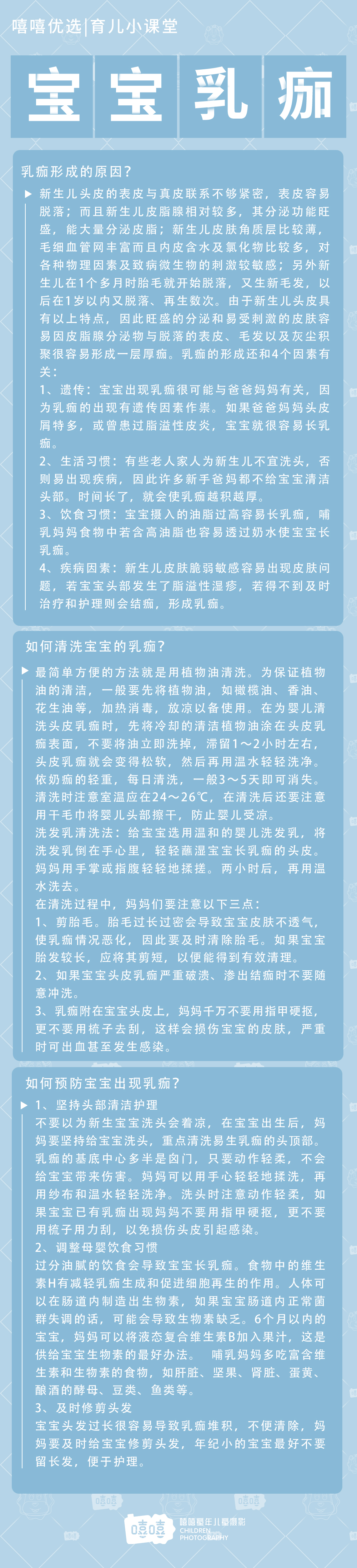 有时候妈妈会发现,新生宝宝头上有一层黄白色分泌物,这种分泌物呈鳞屑状,摸上去有些油腻,看上去像宝宝的脑袋上了蜡一样。这种分泌物其实就是乳痂,又称皮脂溢性头皮炎。乳痂一般不疼不痒,对宝宝的健康也没有明显的影响。这在宝宝中非常普遍,会存在一段时间。乳痂摸上去有些油腻,会脱皮,大部分会自然痊愈,属于暂时性的现象。