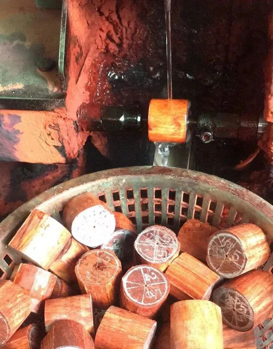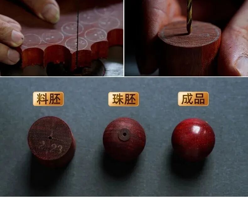 随后,从圆饼上切割下珠胚,切割过程坚持沿年轮纹理下刀,确保每颗珠胚颗颗顺纹正圆,小孔均匀,棕眼与导管走向基本一致。