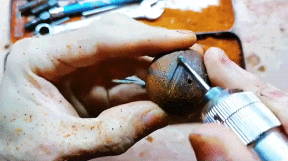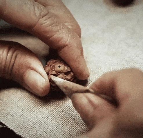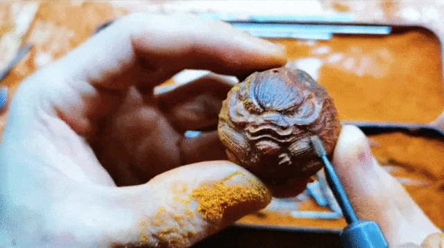 切好的珠胚,送到雕刻师手上。雕刻师要做的是:把木头里的龙子“请”出来。这一步,是最见功夫的地方。