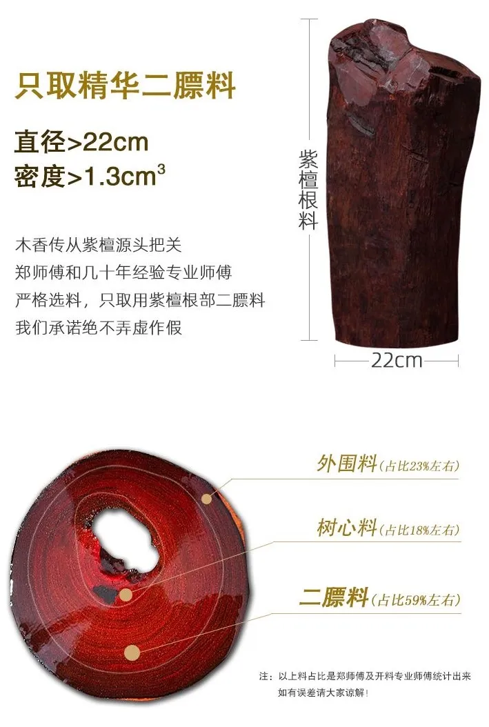 甄选的小叶紫檀,皆是古木老料的“二膘料”——,高油高密、质地坚硬,棕眼细腻如织