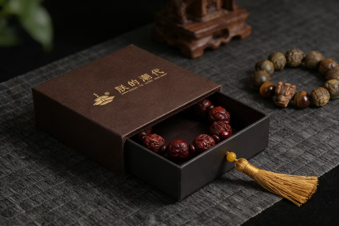 以简约大气的中式礼盒承托文玩本身的雅致底蕴,拿在手里有分量,送出去有体面,