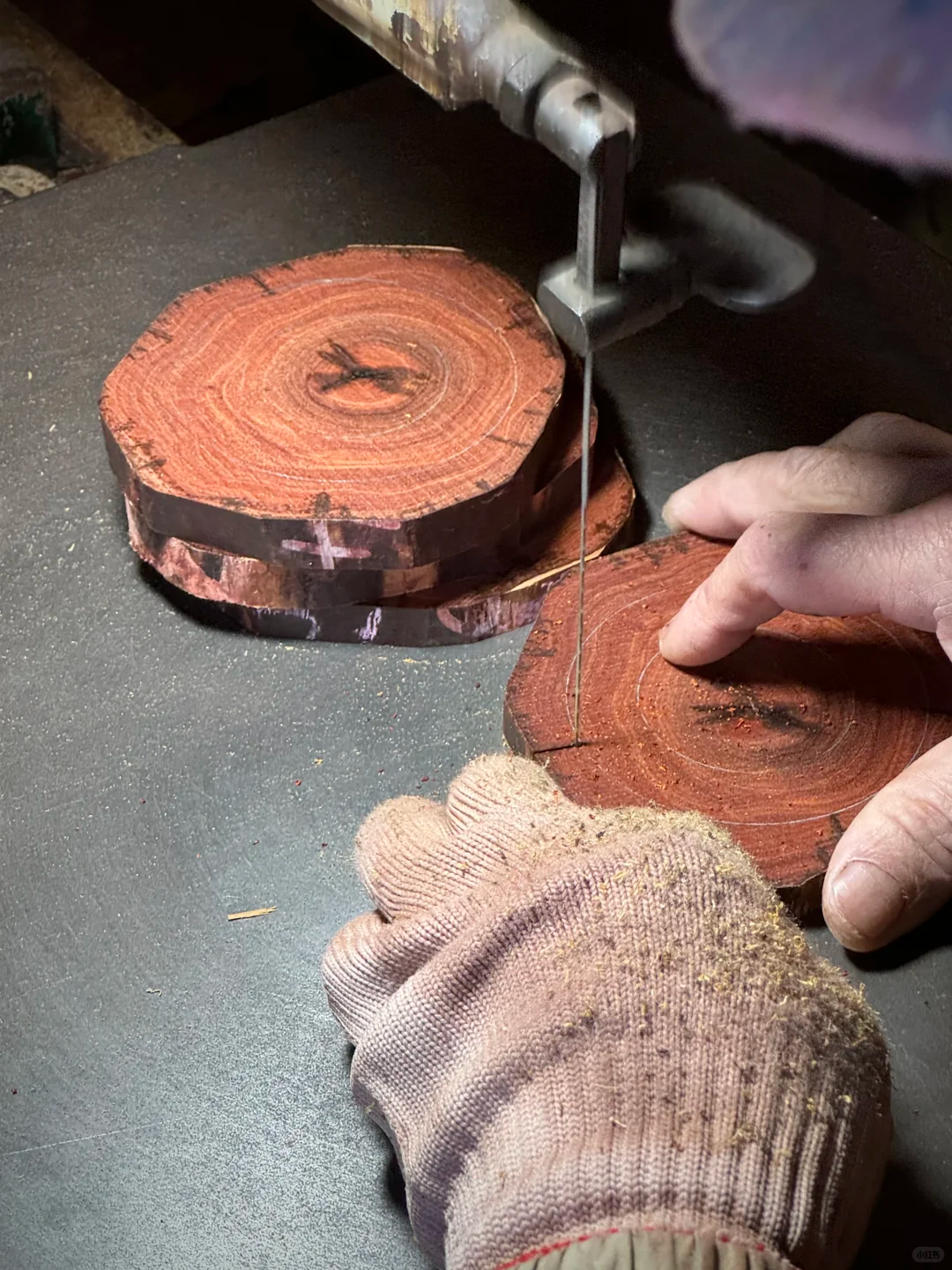 将整块小叶紫檀木置于案头,匠人们凭借多年经验,仔细避开瑕疵与开裂之处,切割出圆饼状木材。
