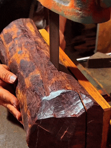 一块紫檀原木运抵工坊,先要经历「三剔法」:剔除边材腐朽处、剔除芯材皲裂痕、剔除阴阳脸色差。