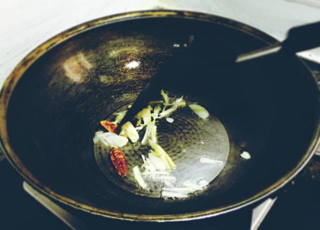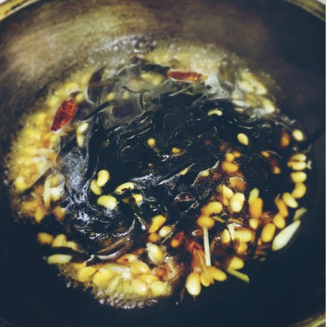 1、锅烧热关火,放半两豆油,半两香油,大料瓣1~2个,开大火炒出香味;