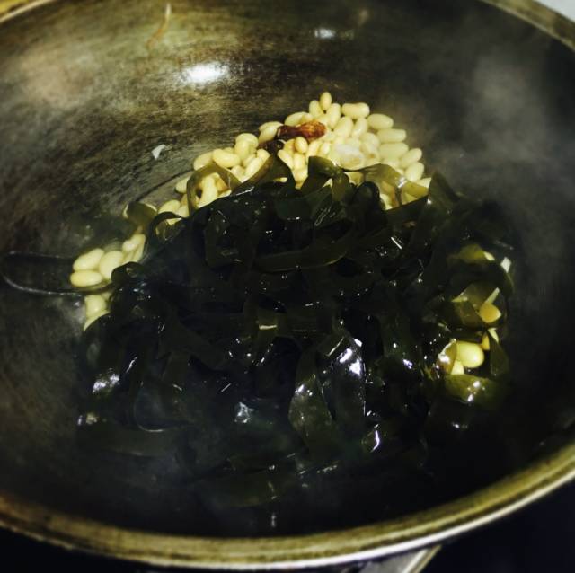 “玉带黄金豆”还有个接地气的名字,叫“海带焖黄豆”!