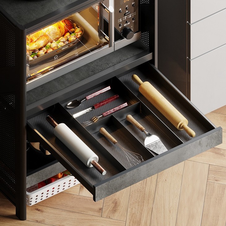 还有我家里的这款多层落地置物架,放在橱柜旁边刚刚好。架子看上去很有质感,每一层都有很大的空间,可以收纳很多东西。当然质量也是我选择它的重要原因之一啦,铝合金的材质,易清洁不生锈,我的烤箱电器统统都有了自己的窝,要用的时候也很方便。