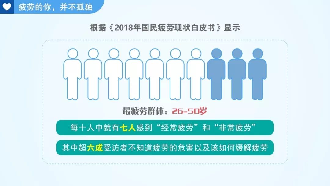 根据人民网《2018年国民疲劳现状白皮书》显示,在“自我疲劳程度”的调查中,疲劳感知已有全民化趋势,每个年龄层都有一半的调查者感到“经常疲劳”和“非常疲劳”。