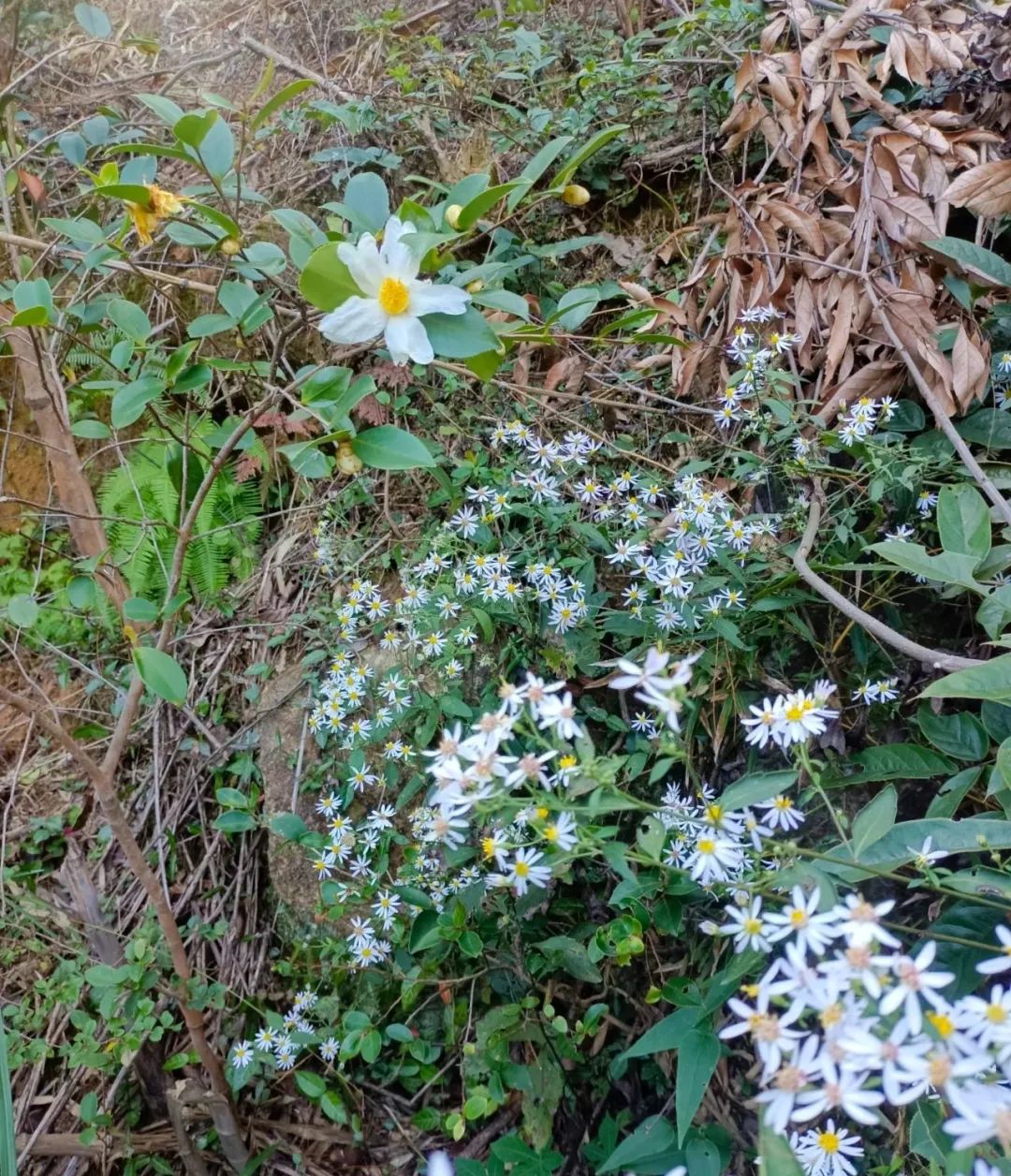 竹丛里的油茶在枝头,泛着太阳晒出的黝红,裂开了壳,似开口笑,灿烂悠然。旁边的小野花,错落有致地簇拥在一起,安静祥和。