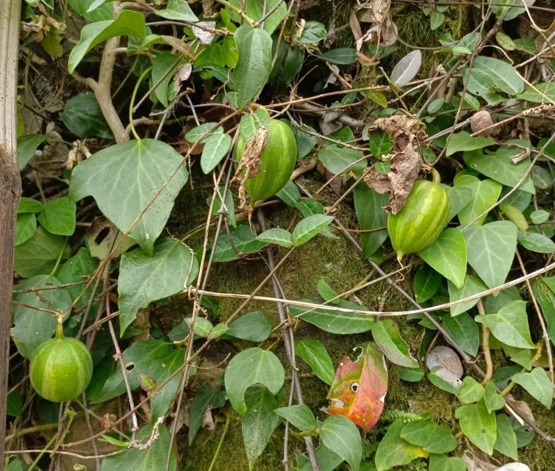 前几天在工地看到的蔓延在大石块上的栝楼(楼,高也),能降高处之痰火而开心胸之痹,青色的瓜皮随着秋凉进入霜降变红,悬挂在藤蔓,灵巧形似心。