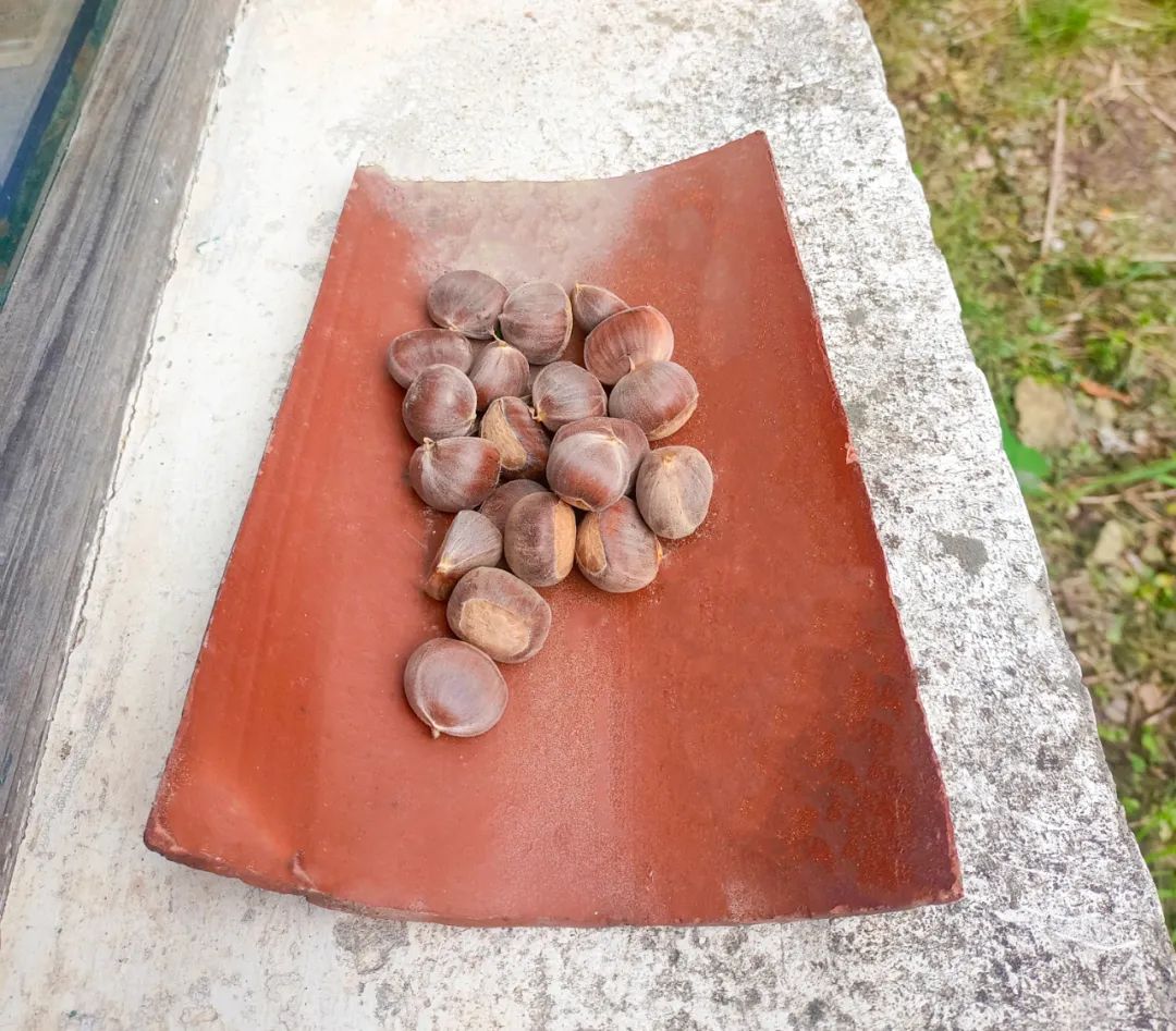 山里土板栗,自然熟透掉落在地上,往返工地与住处,来回上下山顺手捡拾几粒,煮到粥里,增加点儿山里的时序之气与水土之味。这边山里一直到立冬前,还有不少野茼蒿,不由得想起在虚心谷时每年都能吃到从兰阿姨做的清炒野茼蒿。