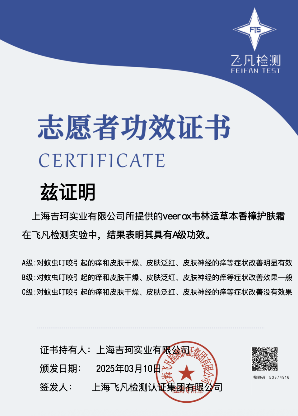 同时,还有志愿者功效证书表明其具有A级功效,对蚊虫叮咬引起的痒和皮肤干燥、泛红等症状改善明显,效果实实在在看得见。