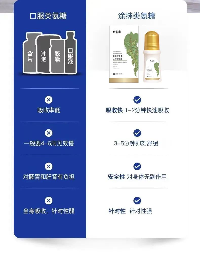 关节上的疼痛,虽然痛在关节,但是根在软骨,源更是在氨糖!!和真源还把氨糖这个成分加入艾灸液里,无需口服氨糖片