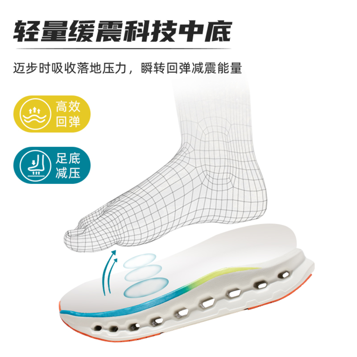 让鞋子快速回到最初的重量,使得行走如在陆地般轻松,托侧排的福,当风从四面八方吹过来,钻入“通风口”,直吹脚底板,凉风阵阵,太爽了。