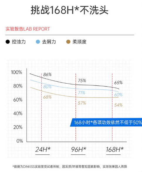 Dinkiss洗发水曾挑战168小时不洗头,也就是一周,结果显示,168小时之后,各项功效依然不低于50%。