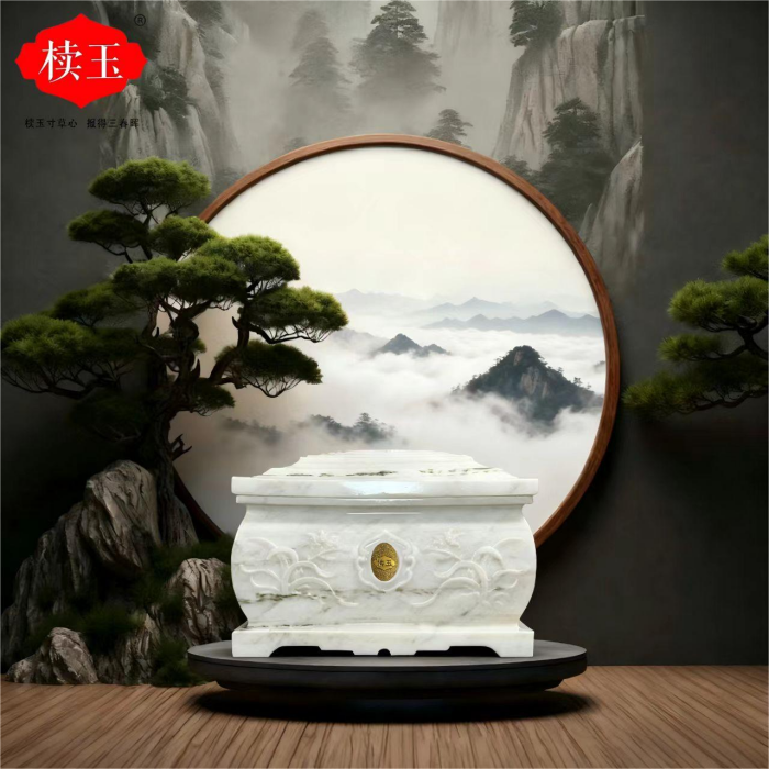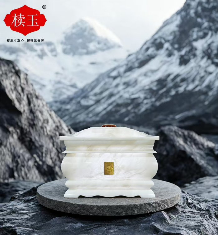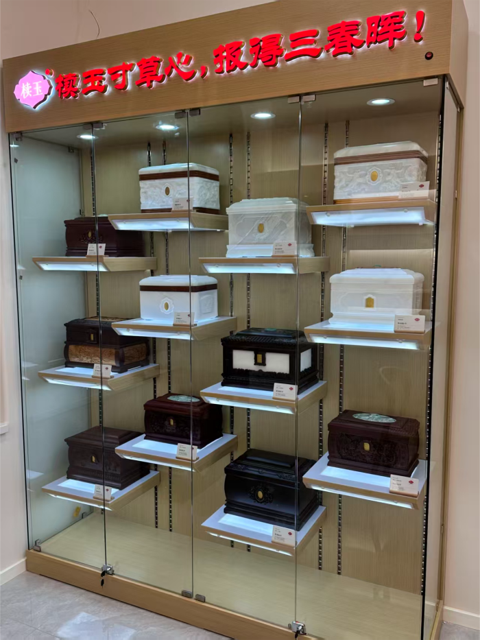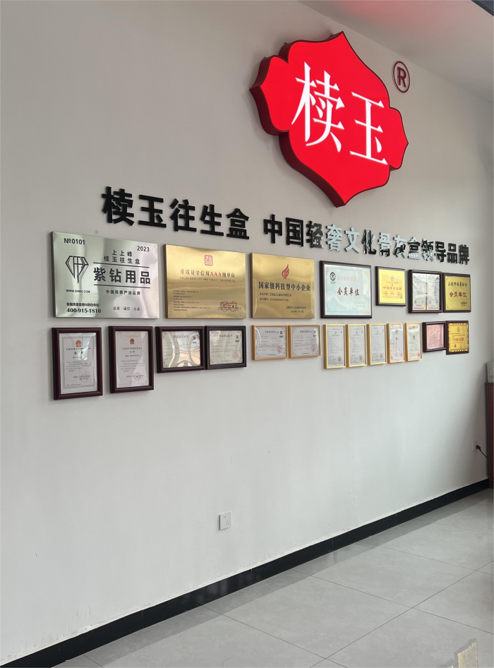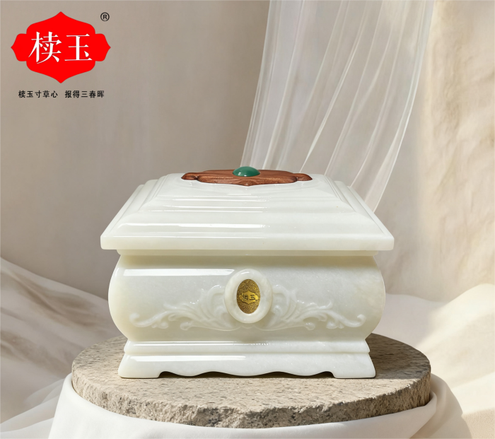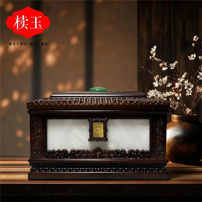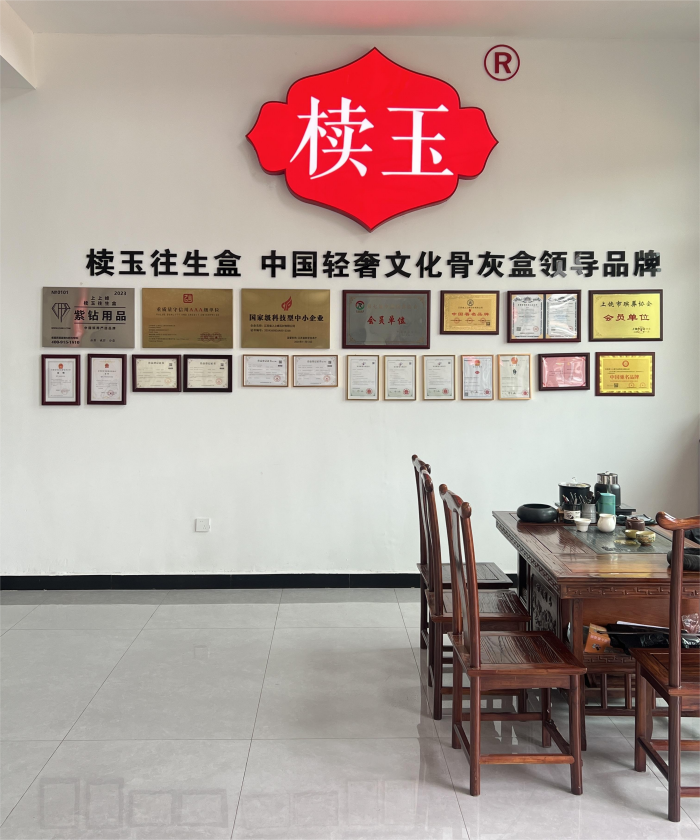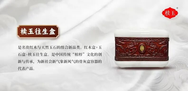 上上峰(江西)生命科技有限公司正在朝骨灰盒领导品牌迈进,我们发挥自身加工玉石工艺的技术优势,将名贵红木与天然玉石结合,首创椟玉往生盒新品类。(椟玉往生盒= 红木盒+玉石盒 )(由中国的成语典故:买椟还珠,引申比拟椟玉往生盒是比珠宝更珍贵的盒子,已注册商标和专利)。