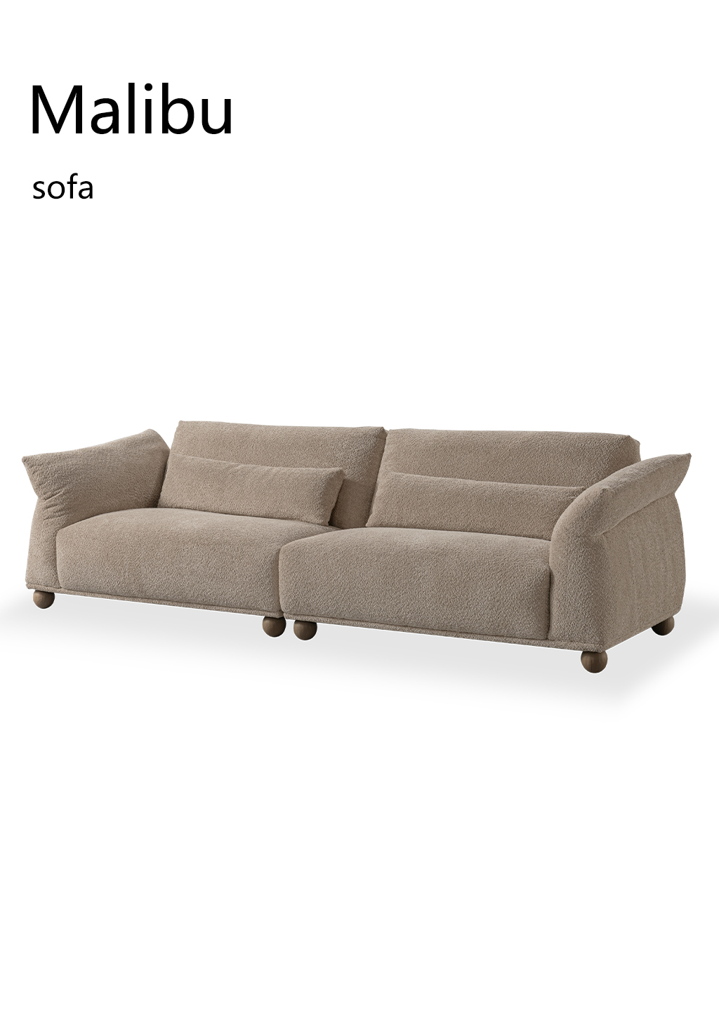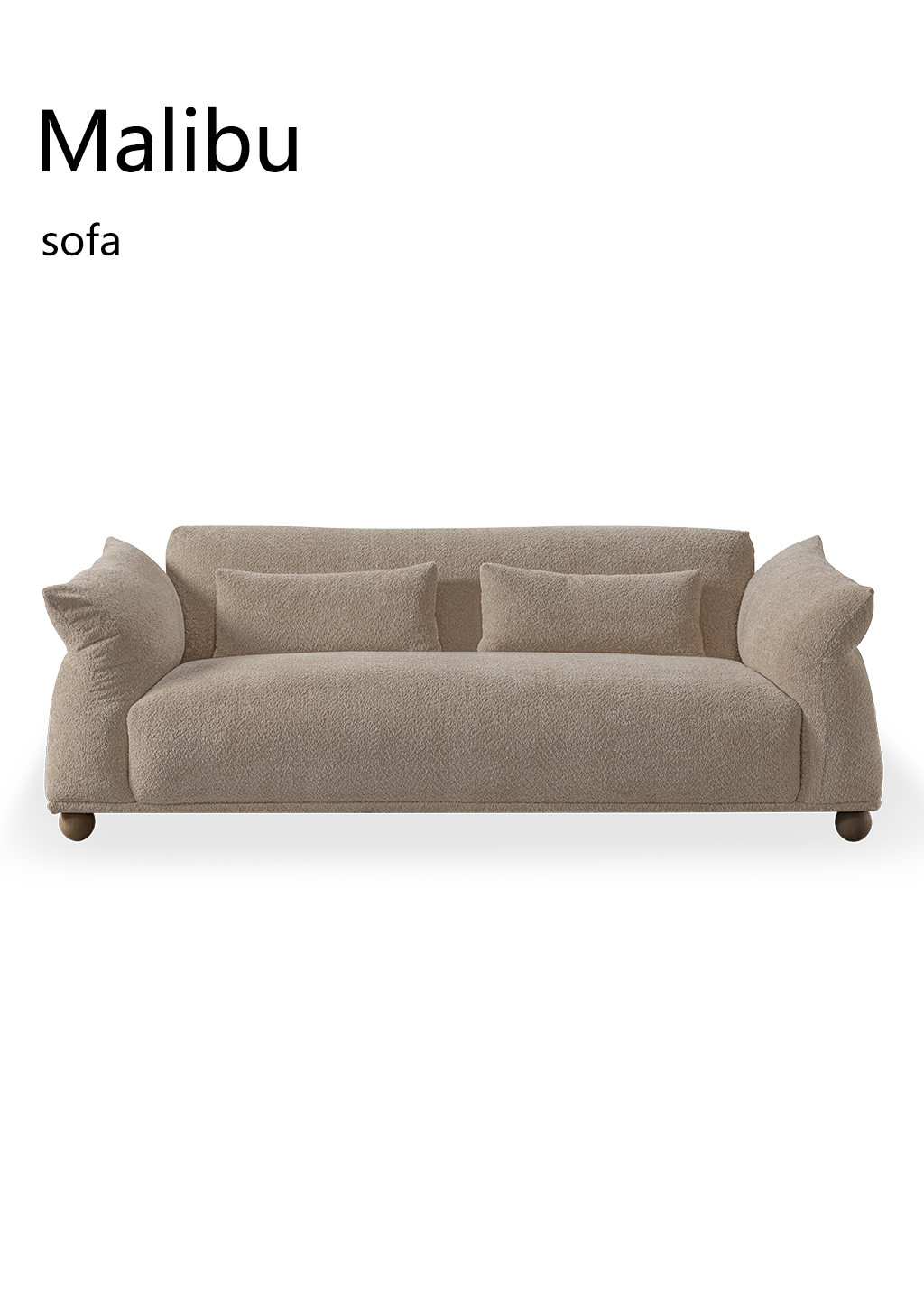 这款Malibu沙发软糯圆润的造型真的很难不爱上。标志型微倾斜扶手设计贴心两用,可坐可躺可趴。提升倚靠舒适度。沙发坐包由填充羽绒和高弹棉,科学配比多层次填充,形成饱满座面,球形沙发脚显得十分可爱,面料精选米色羊羔绒,触感细腻柔软,奶油色系时髦百搭松弛感满分。