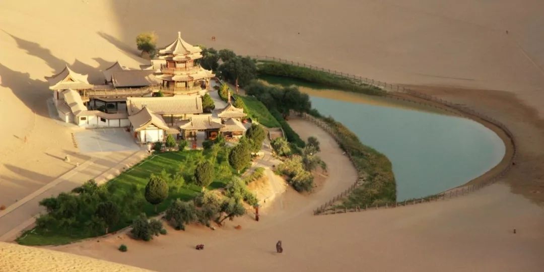 驼队缓缓行进在落日下的大漠,驼铃声鸣响在耳畔,清澈的月牙泉静卧在起伏的鸣沙山中,与散发着缕缕金光的天地融为一体。沙山之上,碧水相依,相映成趣,是为奇景。