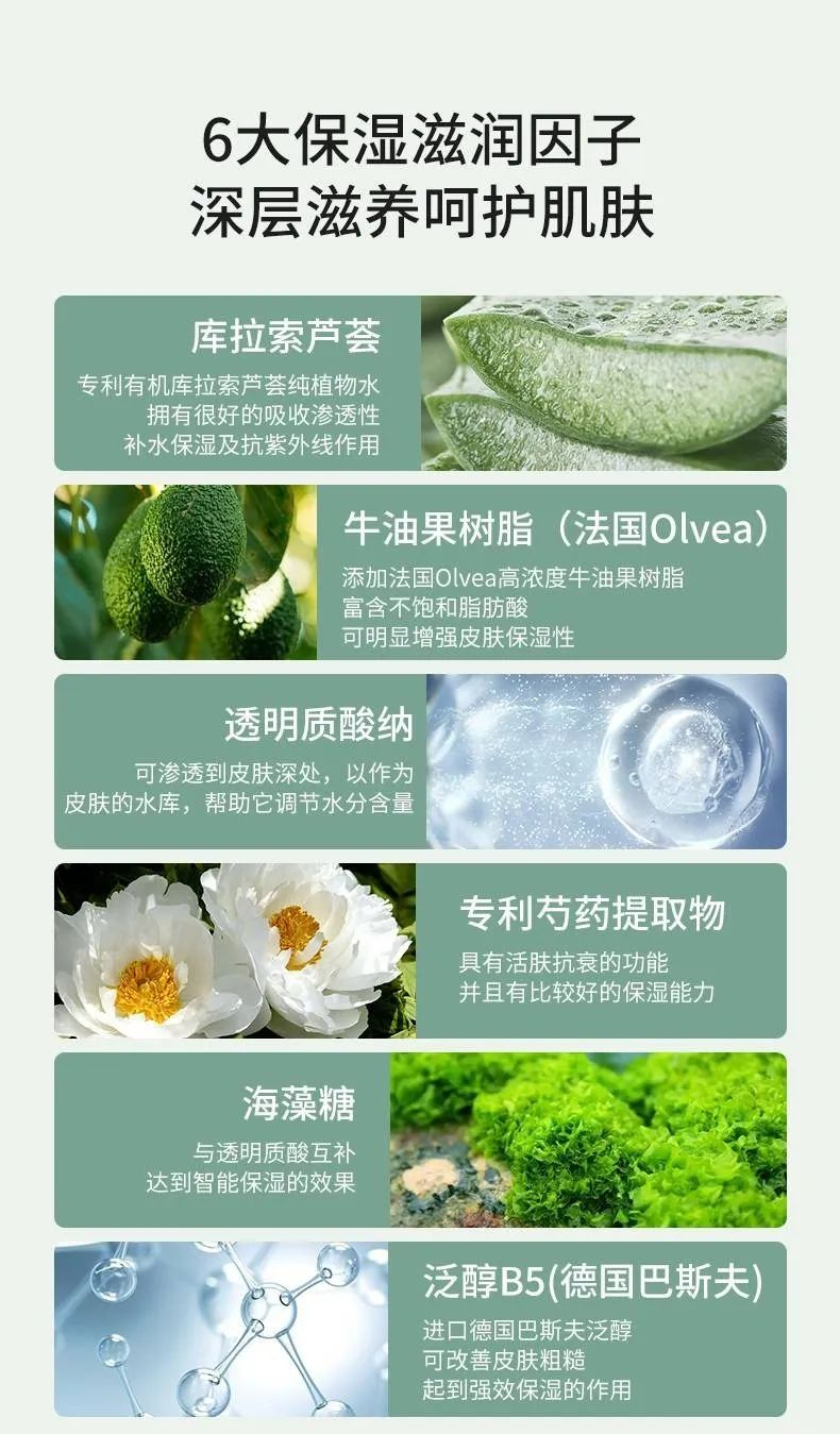 专利芍药提取物具有活肤抗衰的功能;海藻糖可很好地提高皮肤适应环境的能力;泛醇B5(德国巴斯夫)可调理肌肤,强效保湿,改善肌肤粗糙。