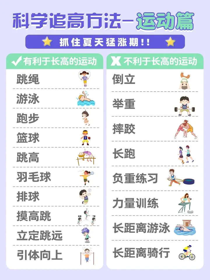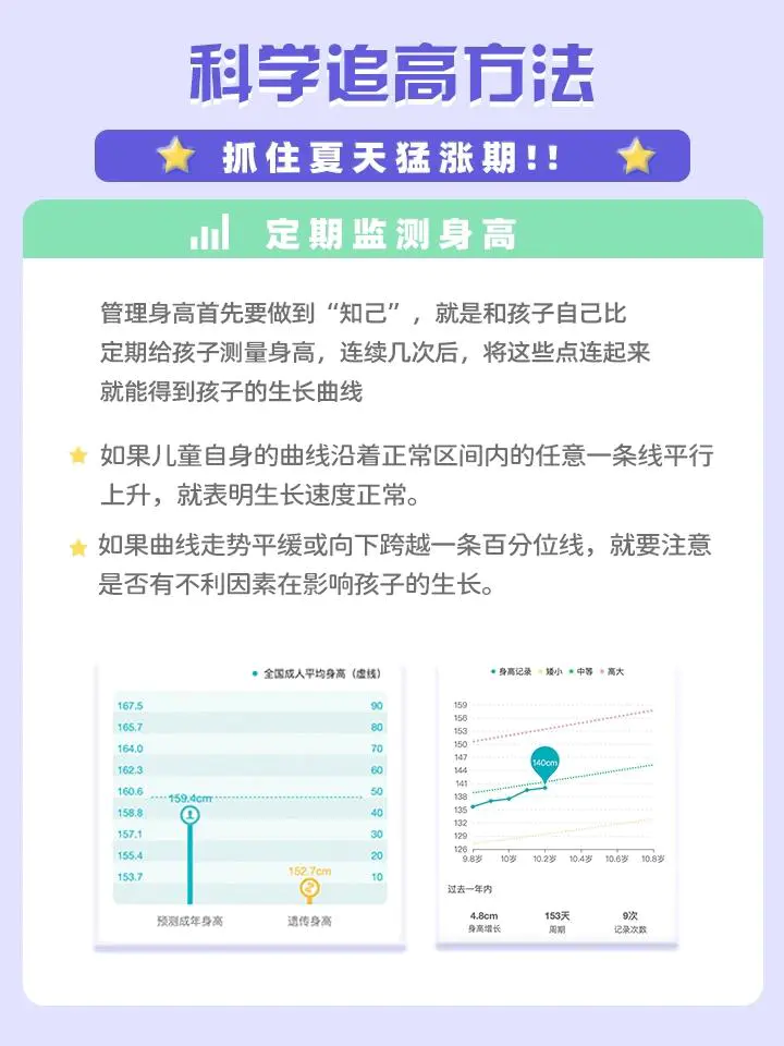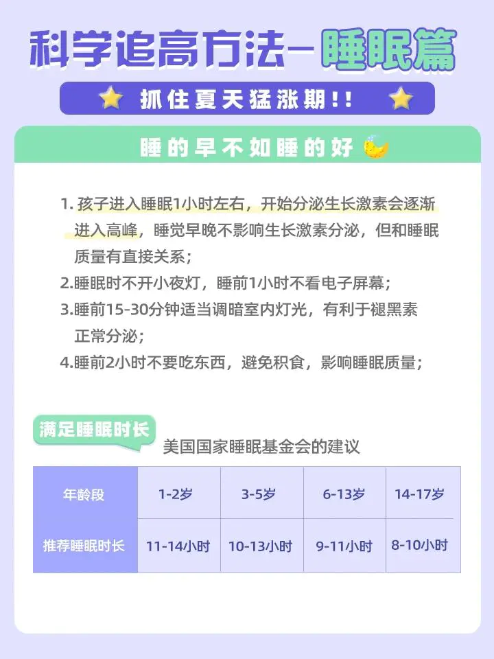 如何抓住夏季长高关键期?赶在骨骺闭合前进行科学增高?给大家整理了4个追高方法,从饮食、运动、睡眠三个要点,和一个盲点身高监测方法入手,详情见图,收藏码住~