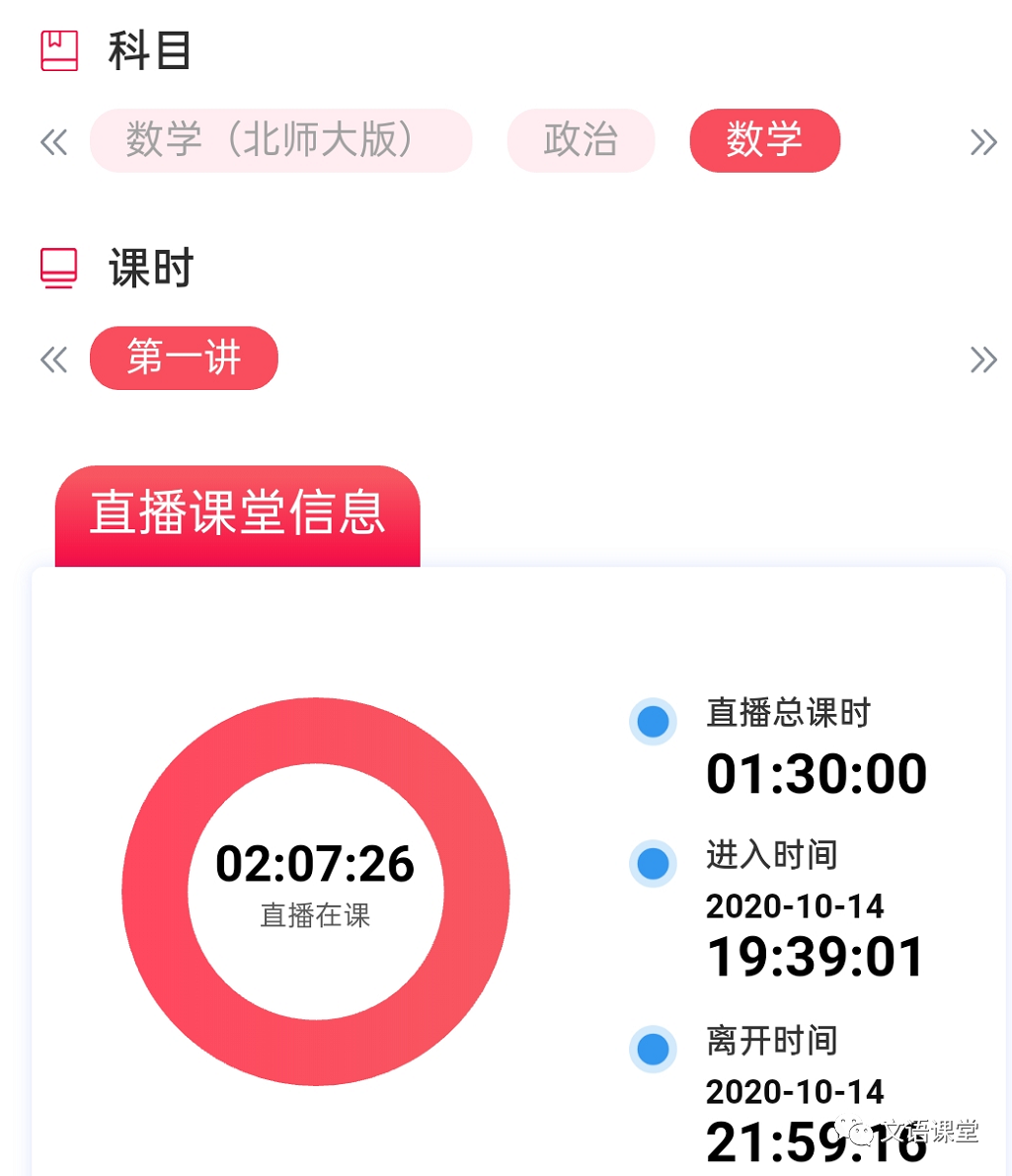 该项目包括学员每节课“进入课堂时间”、“离开课堂时间”、“本节课直播在课时间”三个统计项目。
