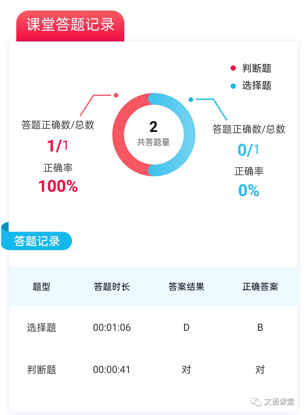 该项目反馈课堂“判断题”和“选择题”的答题情况,并及时记录每道题的正确答案,便于孩子课后复习巩固。