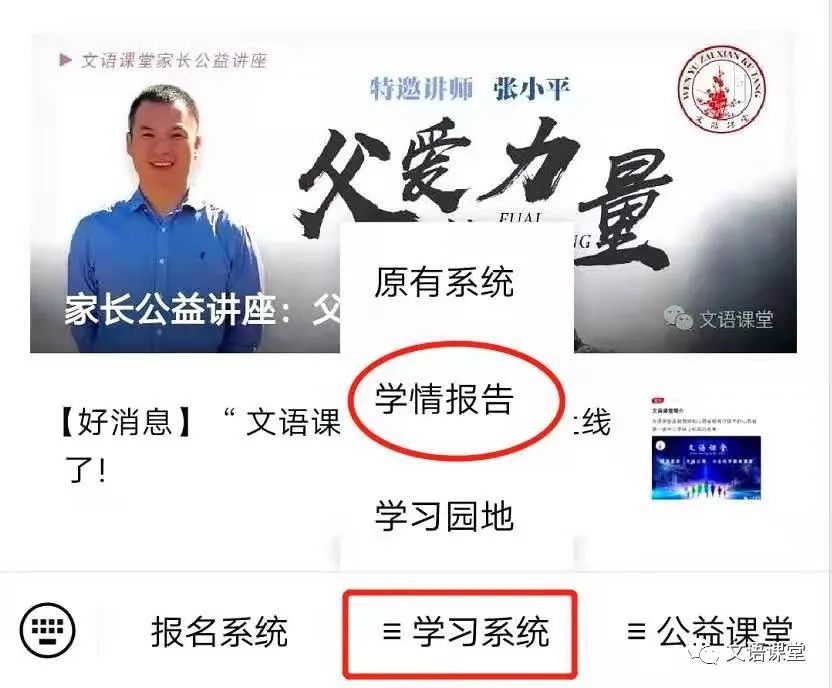 课堂学情反馈报告课后约半小时生成发布,请登录文语课堂微信公众号,点击“学习系统”查询!