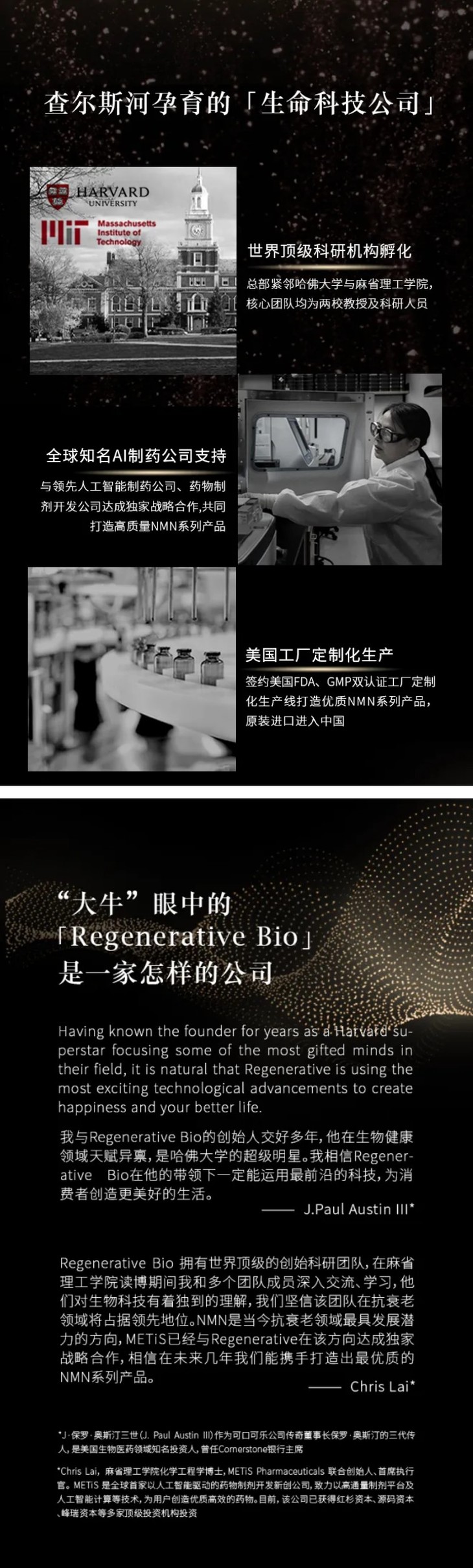 它是来自美国的高科技抗衰品牌——Regenrative Bio,致力于将AI制药相关技术与生物学结合,探索具有抗衰老功效的成分、配方及疗法并提供抗衰老产品及服务,解决人类因年龄增长引起的系列健康问题,延长人类健康寿命。