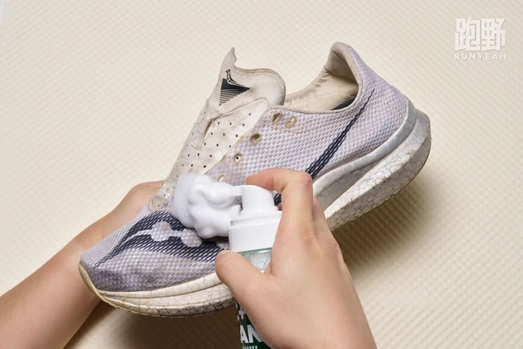 完成了鞋底残留物的清理后,清洁的“核心工作”正式开始。我们先往跑鞋喷上适量的清洁泡沫,稍微静置几分钟,让清洁泡沫与鞋面进行反应。