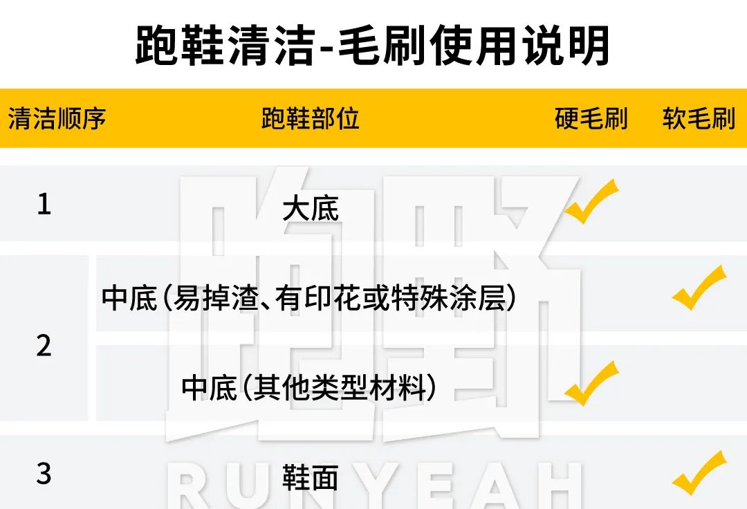 清洁时跑鞋的不同部分、不同的材质需要使用不同的毛刷,详细信息可见下图的说明。