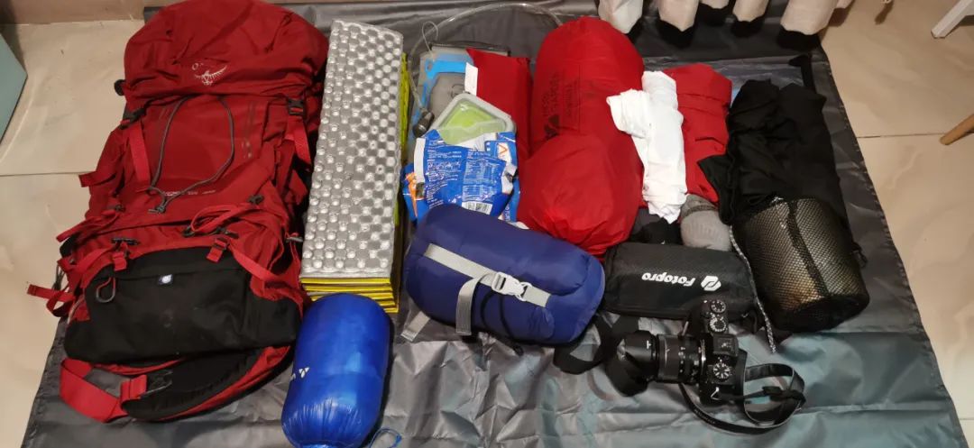 穿的:凯乐石冲锋衣、快干裤、快干衣*2、内裤袜子若干