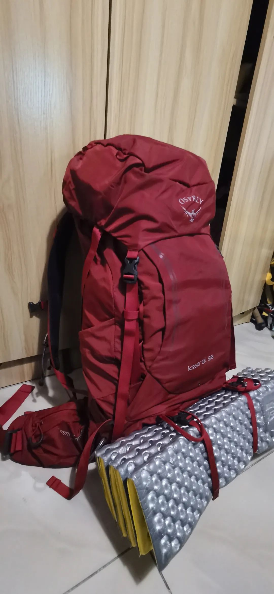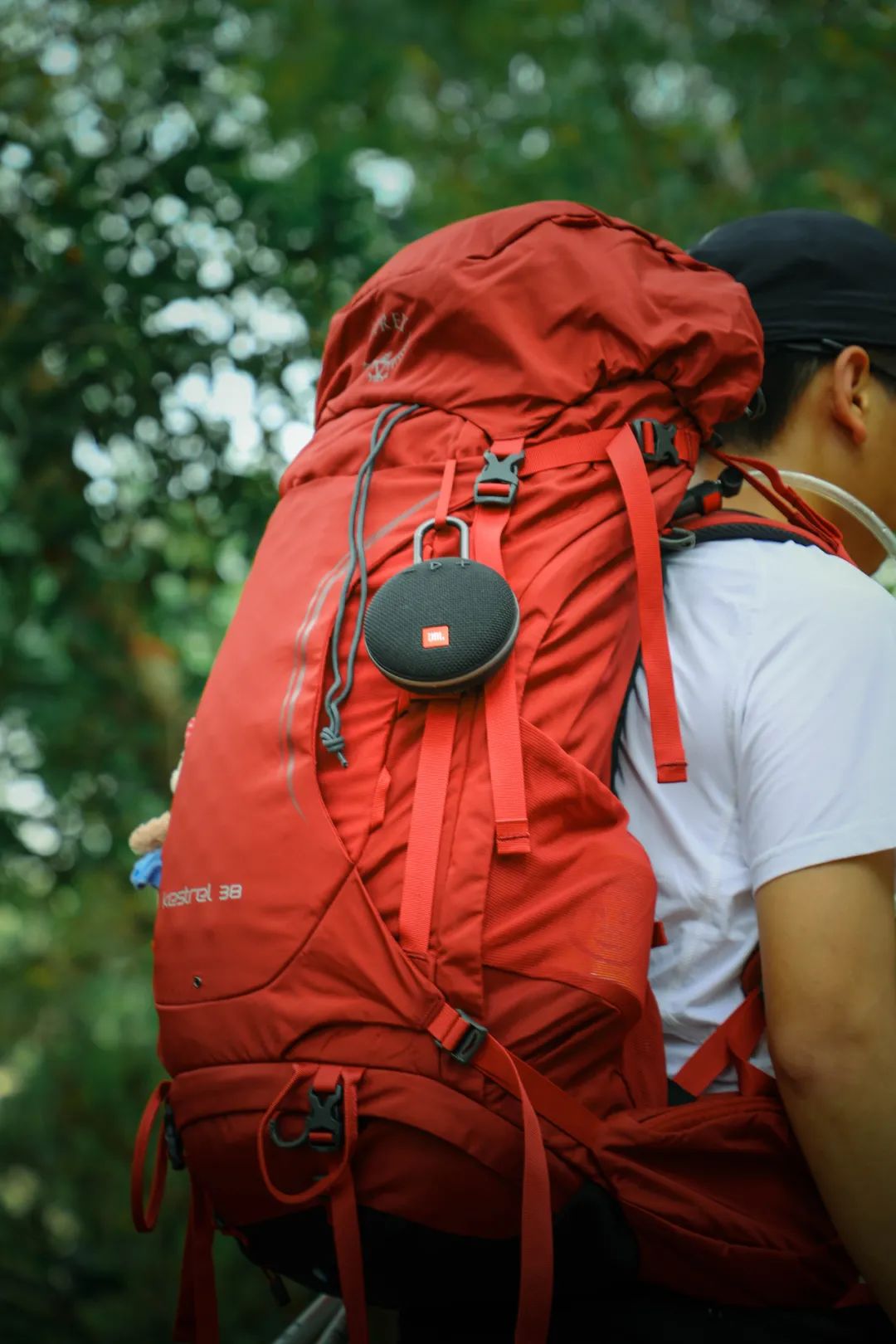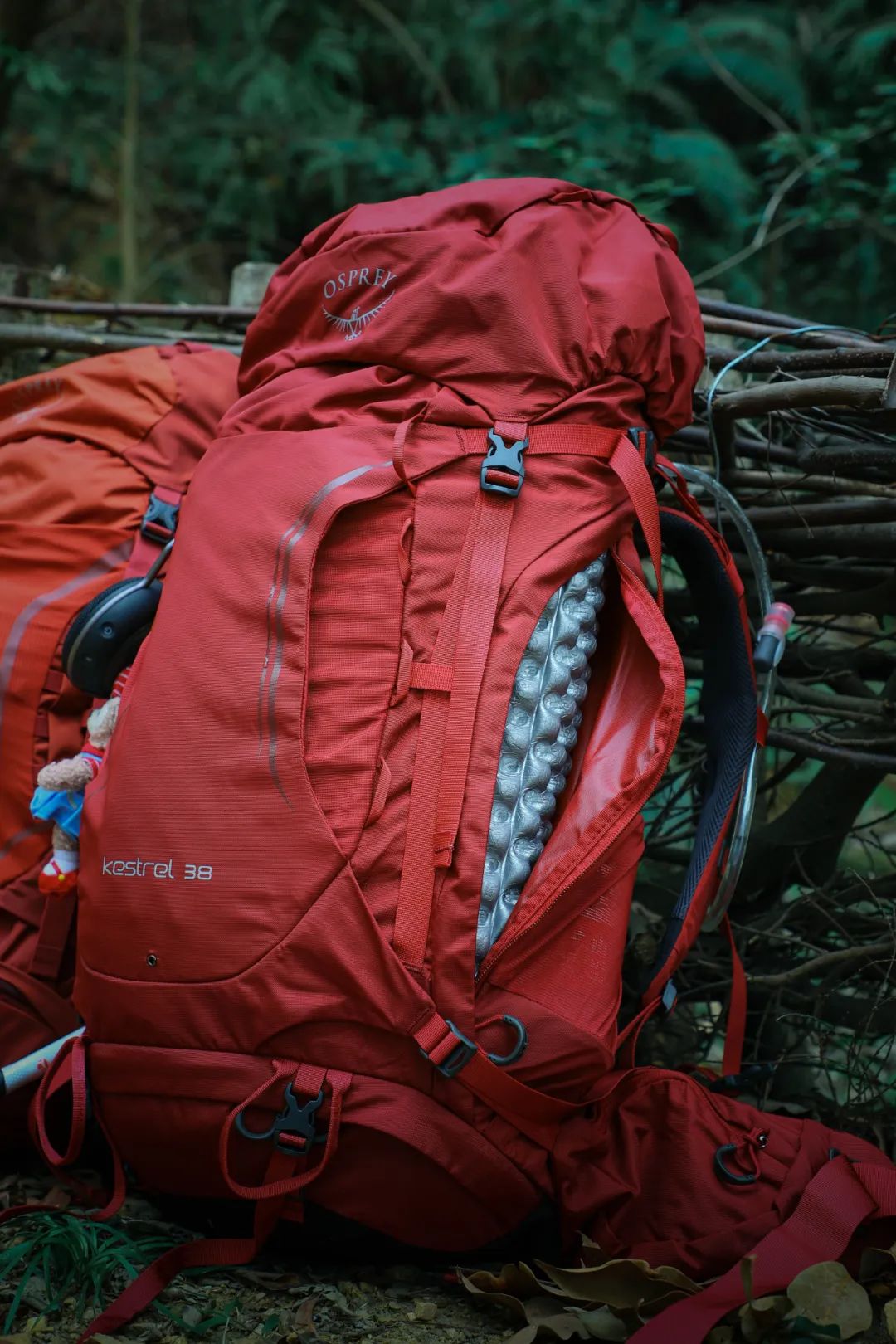 小鹰38升定位在兼顾一日徒步且兼容两天一夜露营活动的背包,M/L码自重1.54KG,兼容3L水袋、自带防雨罩。