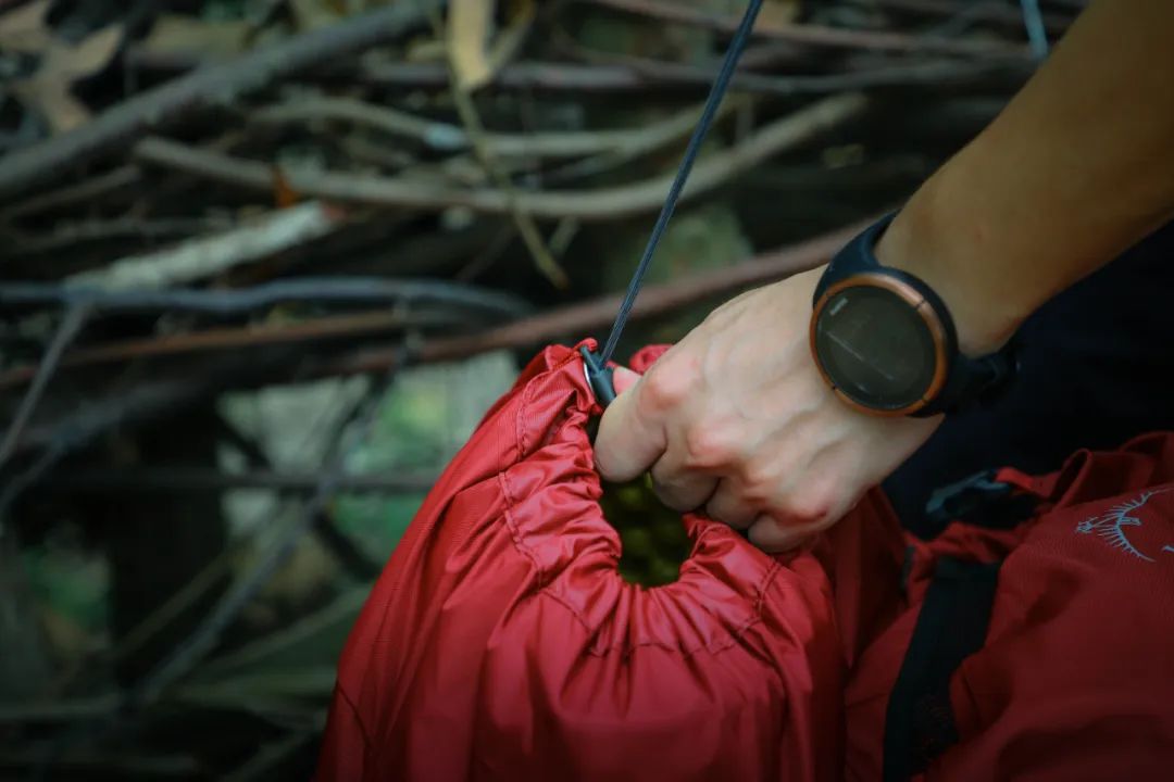 接着,来看看主仓位置,在打包之后,我们可以将此处的收绳收紧,防止包内物品松动。在新设计的滑扣的帮助下,收紧主仓只需要提着滑扣收紧抽绳,松手后自动锁定仓口大小,当你需要打开主仓的时候只需要掰动滑扣即可顺畅打开。