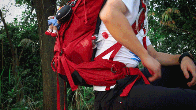 在顶包、包身、包屁股都设置了很多外挂锚点,户外的吉祥物、音箱、防潮垫等可以外挂的装备都可以随心所欲的挂在背包外边,只要做合理的挂载,小鹰能携带更多的户外装备。