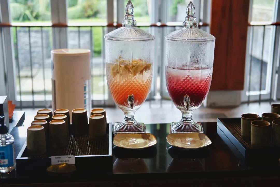 Check in时,酒店在前台放置了可自取的欢迎果汁,还热情的给大家递毛巾擦拭雨水。